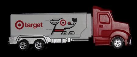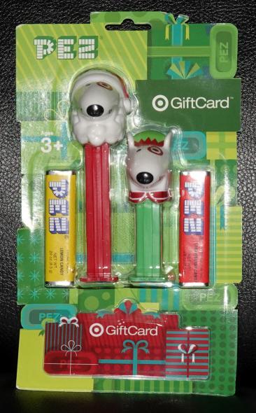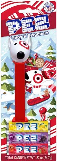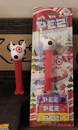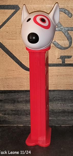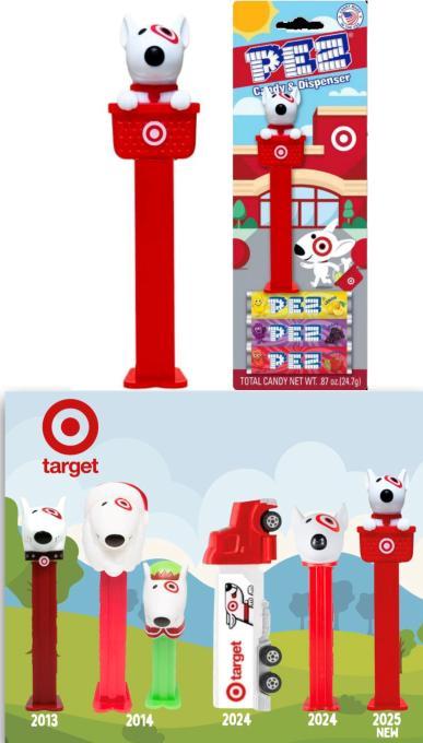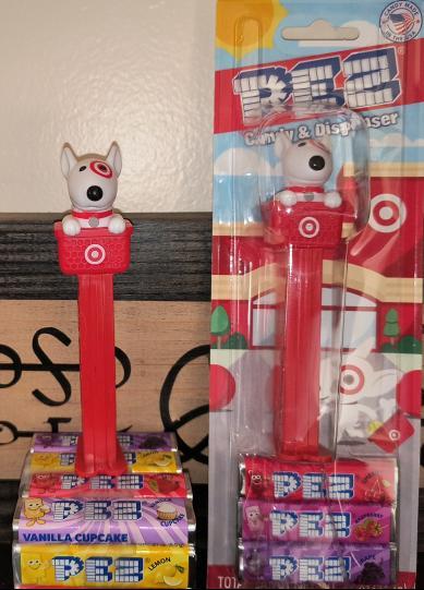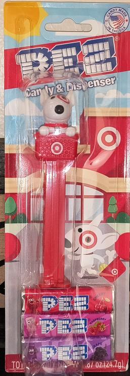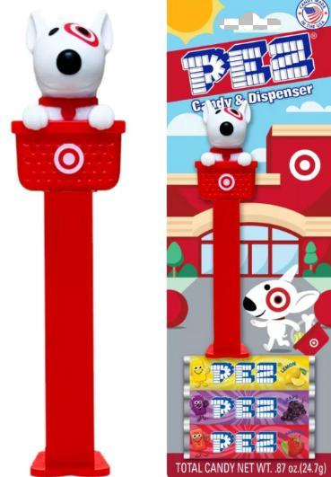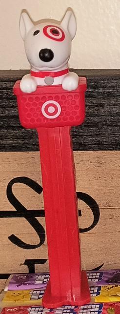 MOC - Target pup sitting sweetly in a basket. Target-red-and-white bullseye logo, integrated into the baskets design.