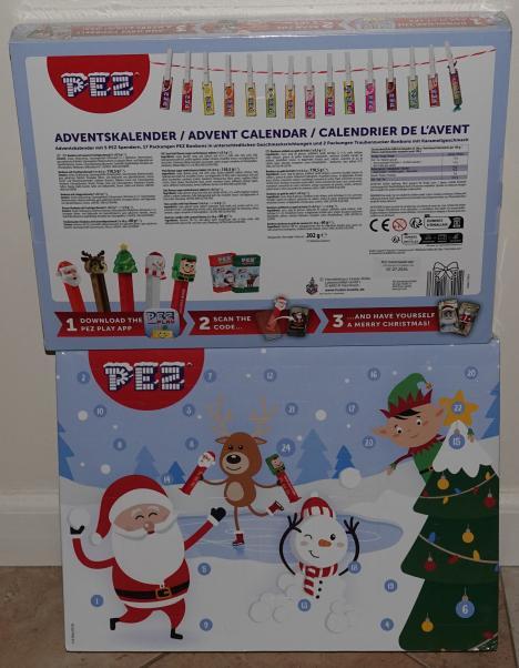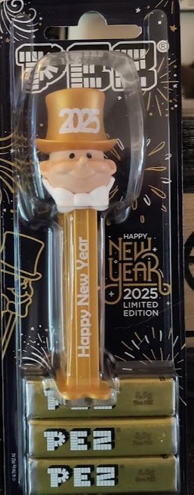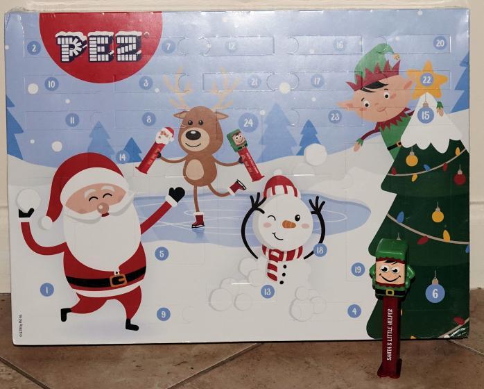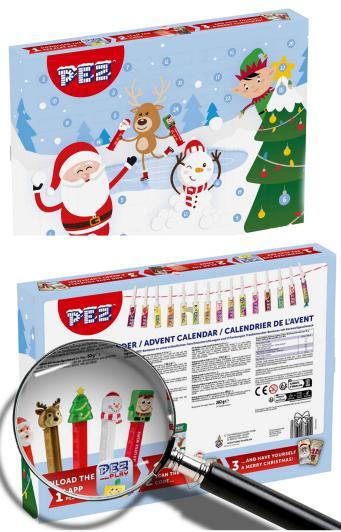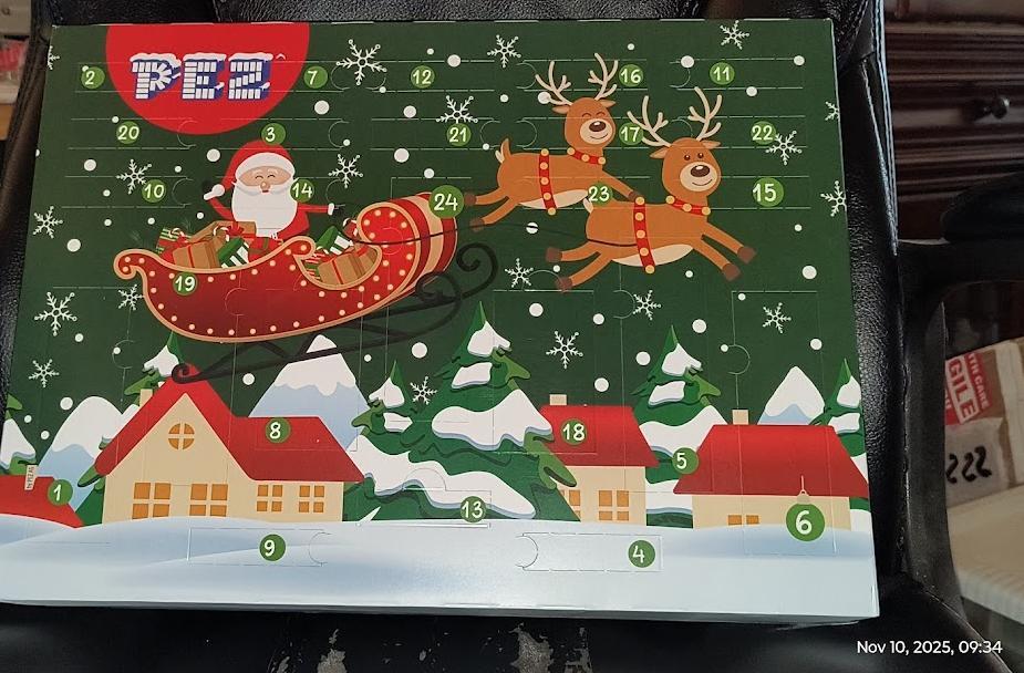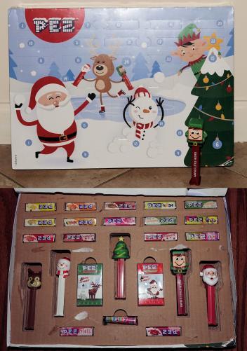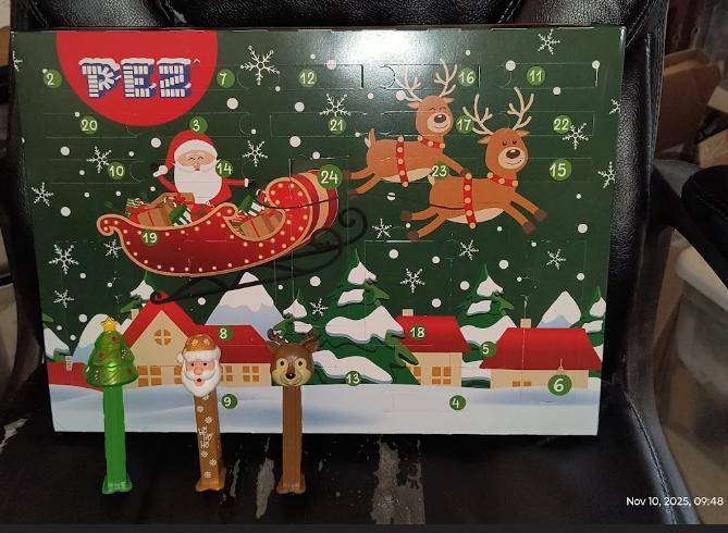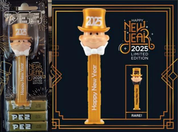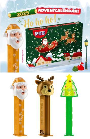 MIB 2025 Advent Calendar from UK. w/special edition Golden Santa with snowflakes on stem This special dispenser features: A golden stem with white HO HO HO printed on it. Beautiful white snowflakes on both the stem and Santas golden hat. Also has Reindeer and Crystal Christmas Tree Dispensers