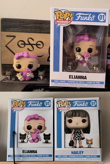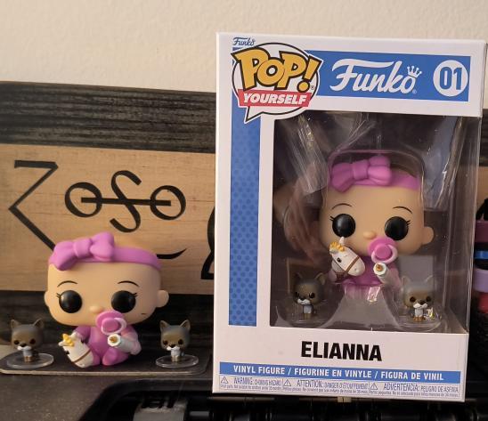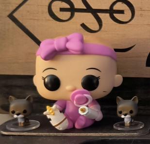 Customized Pop! for ErL 1st birthday. Has her pink outfit w/bow, and a bottle and pony stick. and 2 tiny puppies for Barney and Snoopy. You are One of One on box.